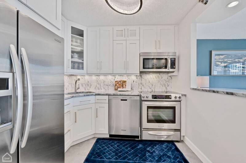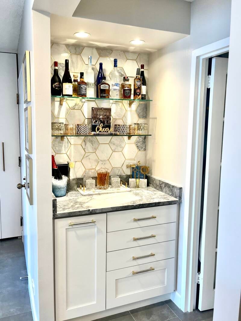 The kitchen and bath are designed with finishes that exceed expectations: granite countertops, 42-inch cabinetry, strikingly beautiful backsplash tile, and custom accent walls. Upgraded designer lighting, fixtures, and finishes complement the high-end kitchen with stainless steel Kitchen Aid appliances. A stunning custom dry bar with imported marble tile and glass shelving offers a perfect spot for a cocktail bar or espresso station.